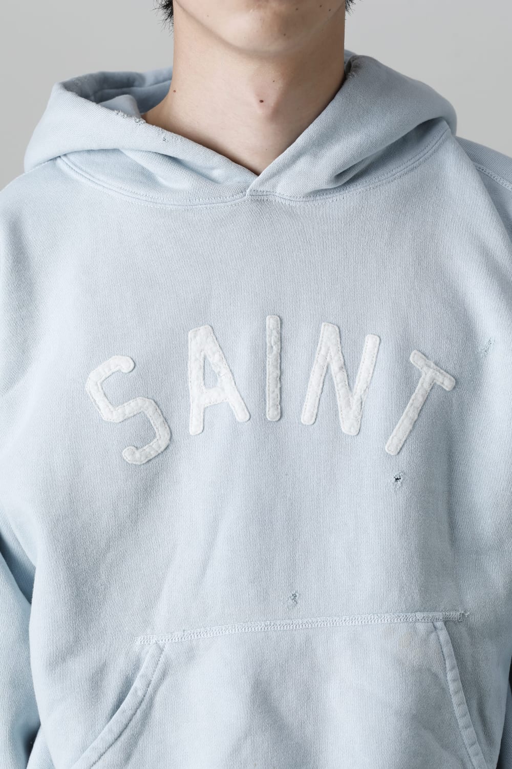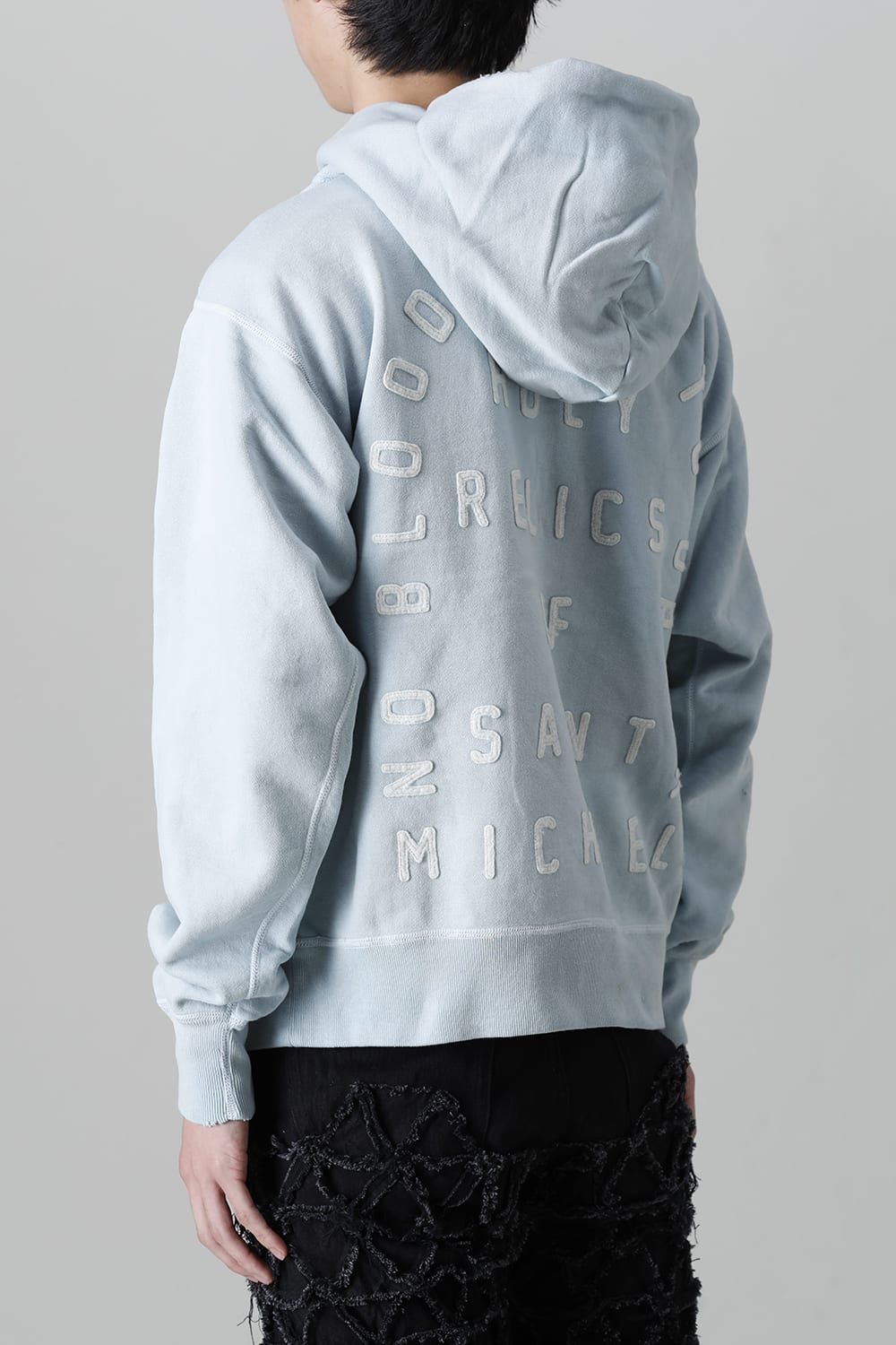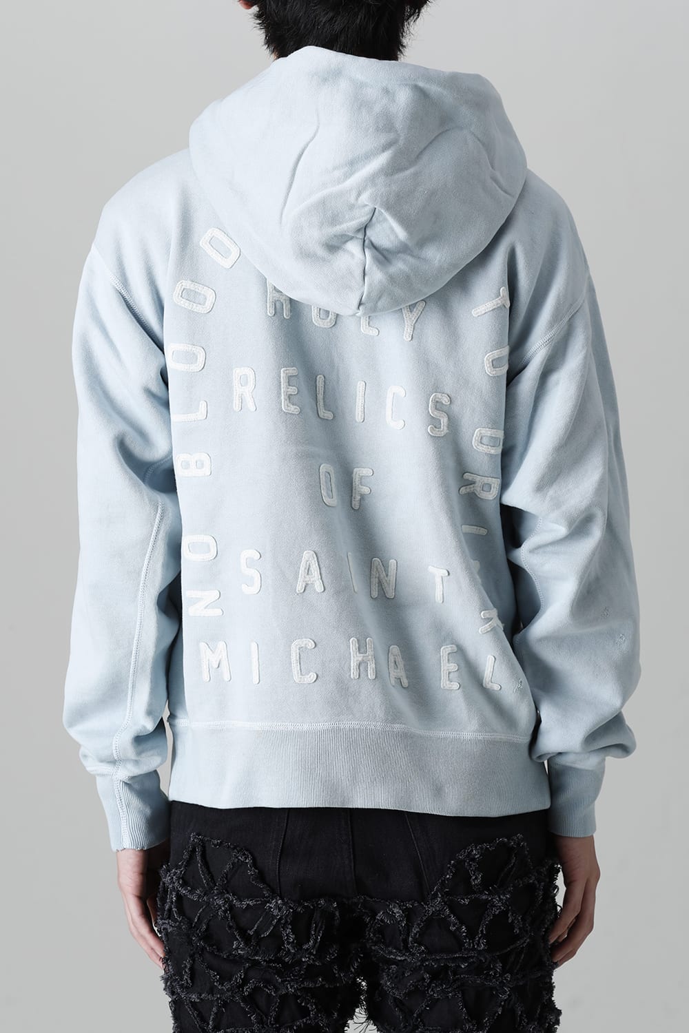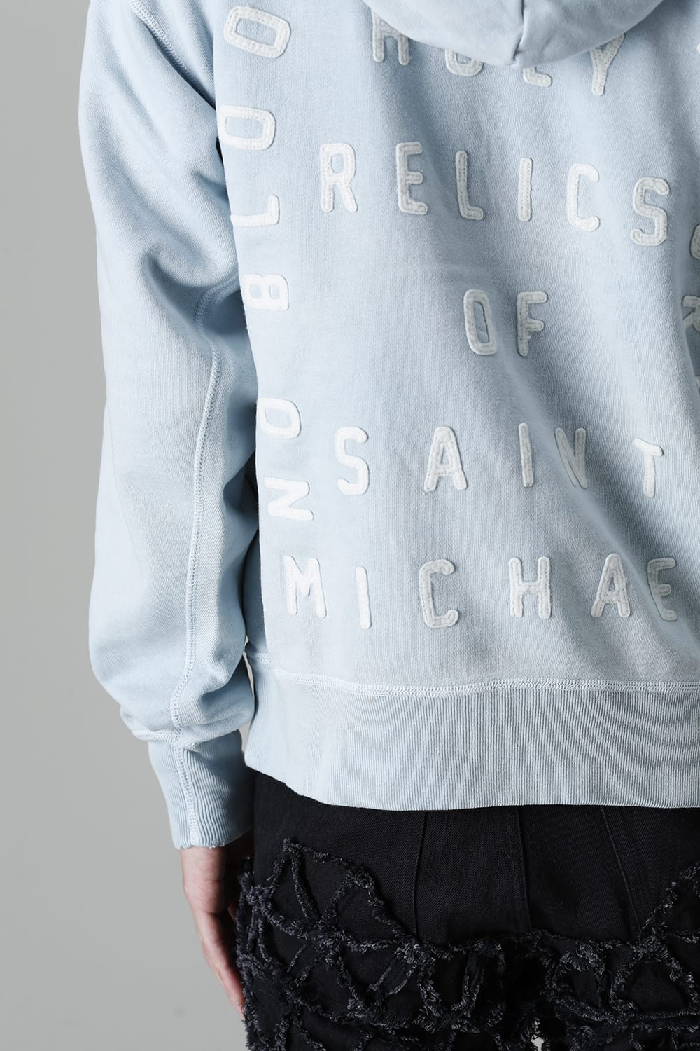 大受欢迎的HOLY RELICS系列,以前面的“SAINT”后面的“HOLY RELICS OF SAINT MICHAEL”、“NO BLOOD LEFT TO DRINK”等文字,再现了在以前没有印花技术的时代里,将毛毡面料裁剪缝上装饰的细节设计。