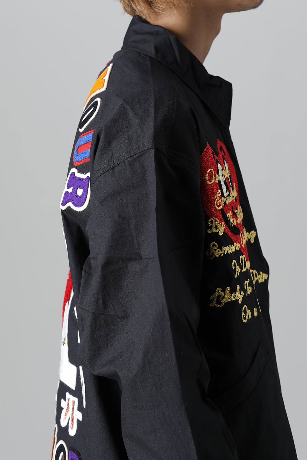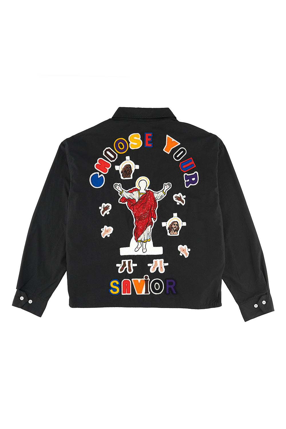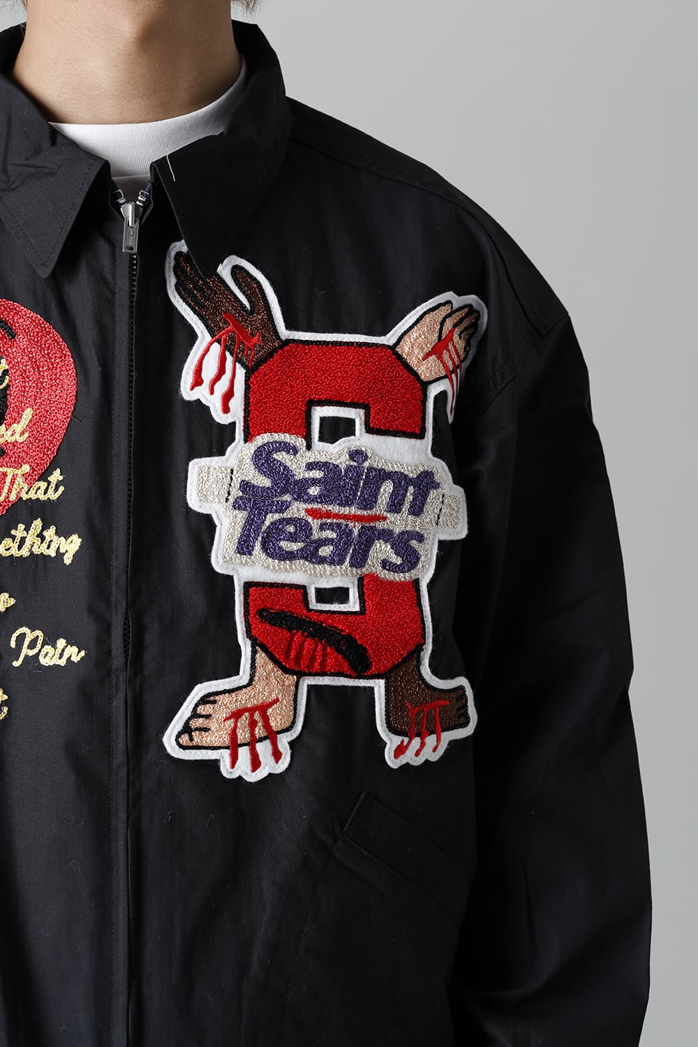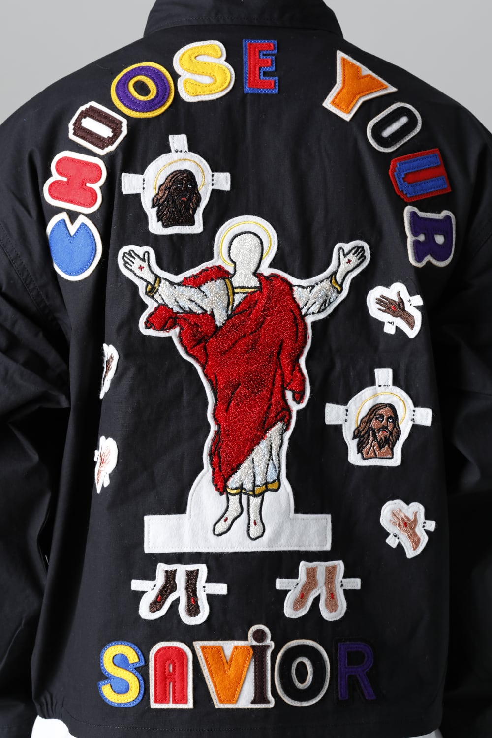 背面加入了以耶稣基督和SAINT TEARS展开的纸人偶为主题的图案刺绣,是一款特别的单品。