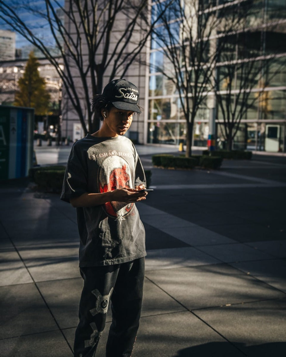 前面印有魔鬼和原创字体,意味着“血液流通的肉体-FLESH AND BLOOD”的印花,给人以深刻的印象。