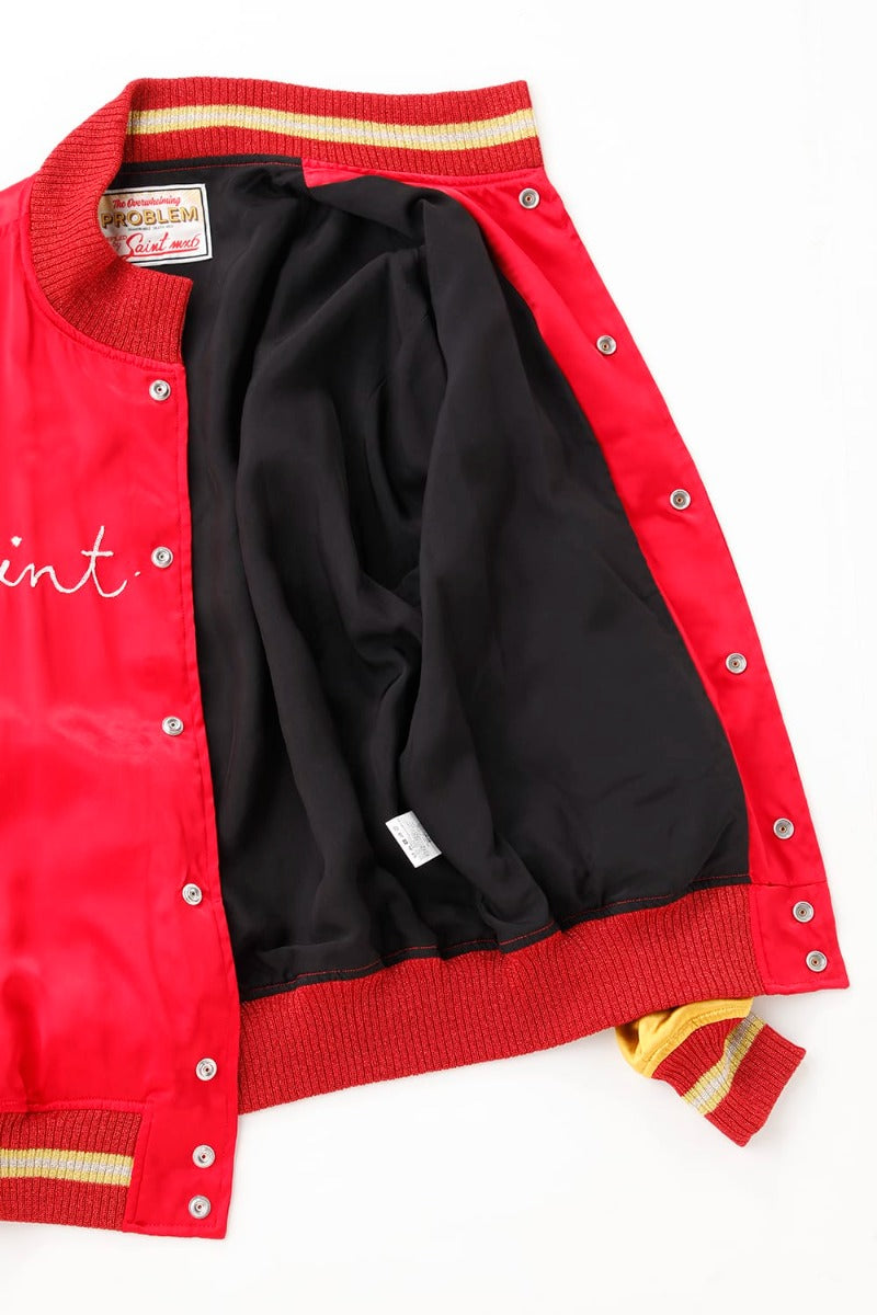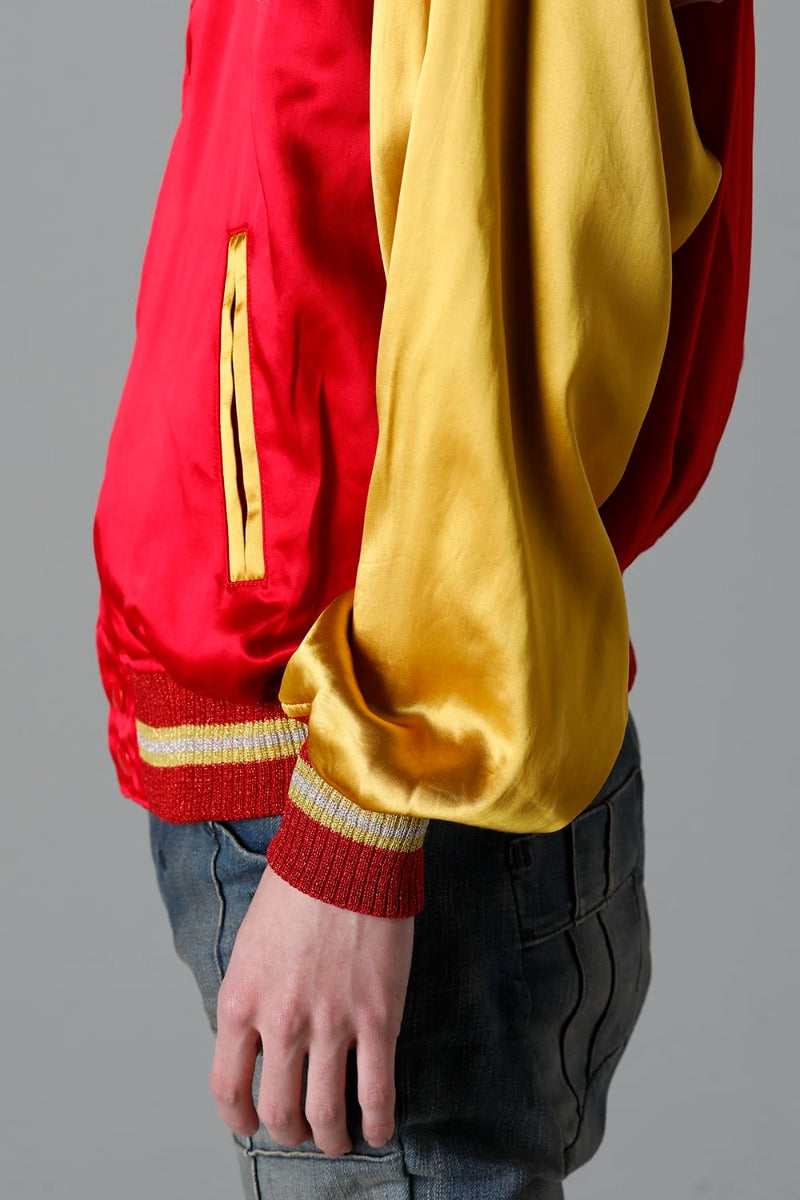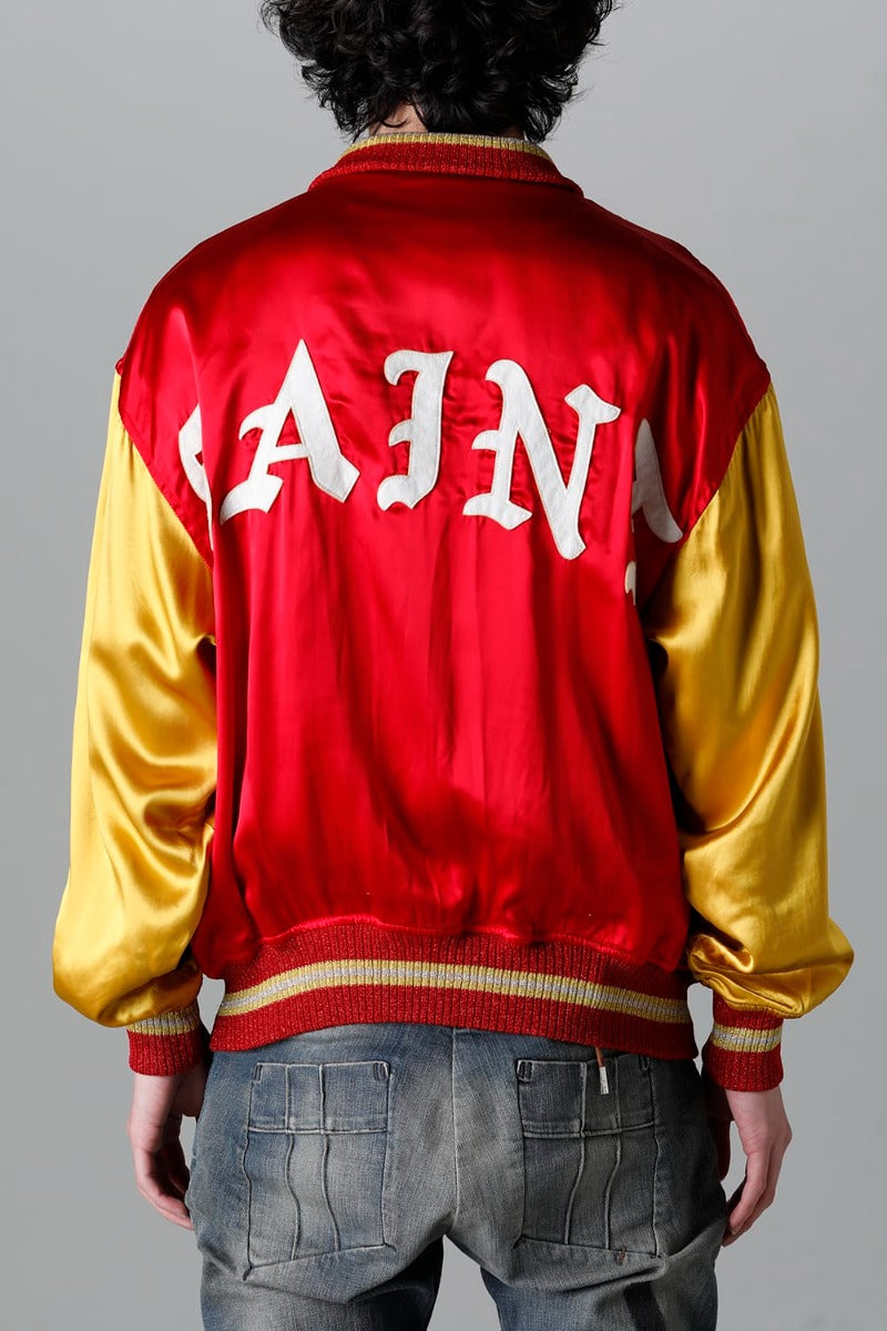 垂坠感和光泽感极具魅力的人造纤维面料的衣身,领子和罗纹部分采用了具有亮线质感的面料制成的大学夹克。