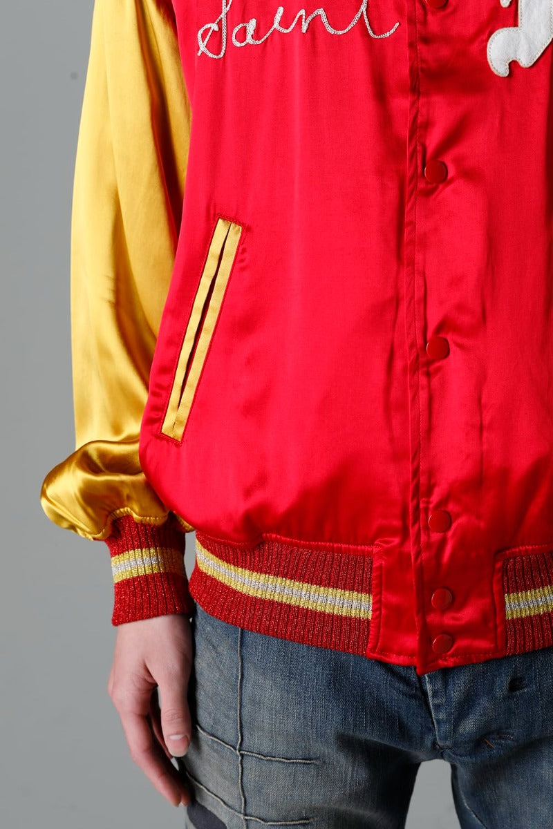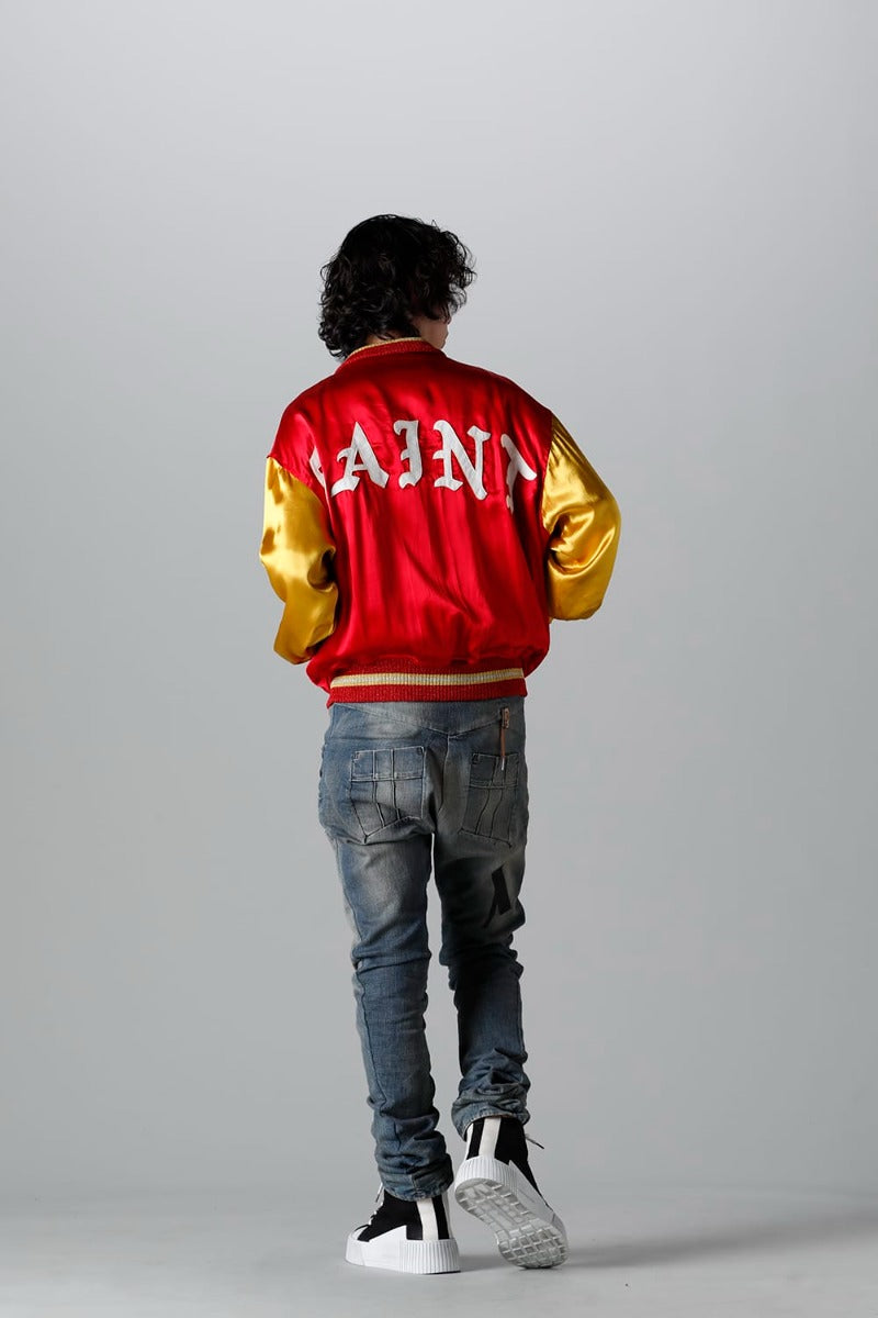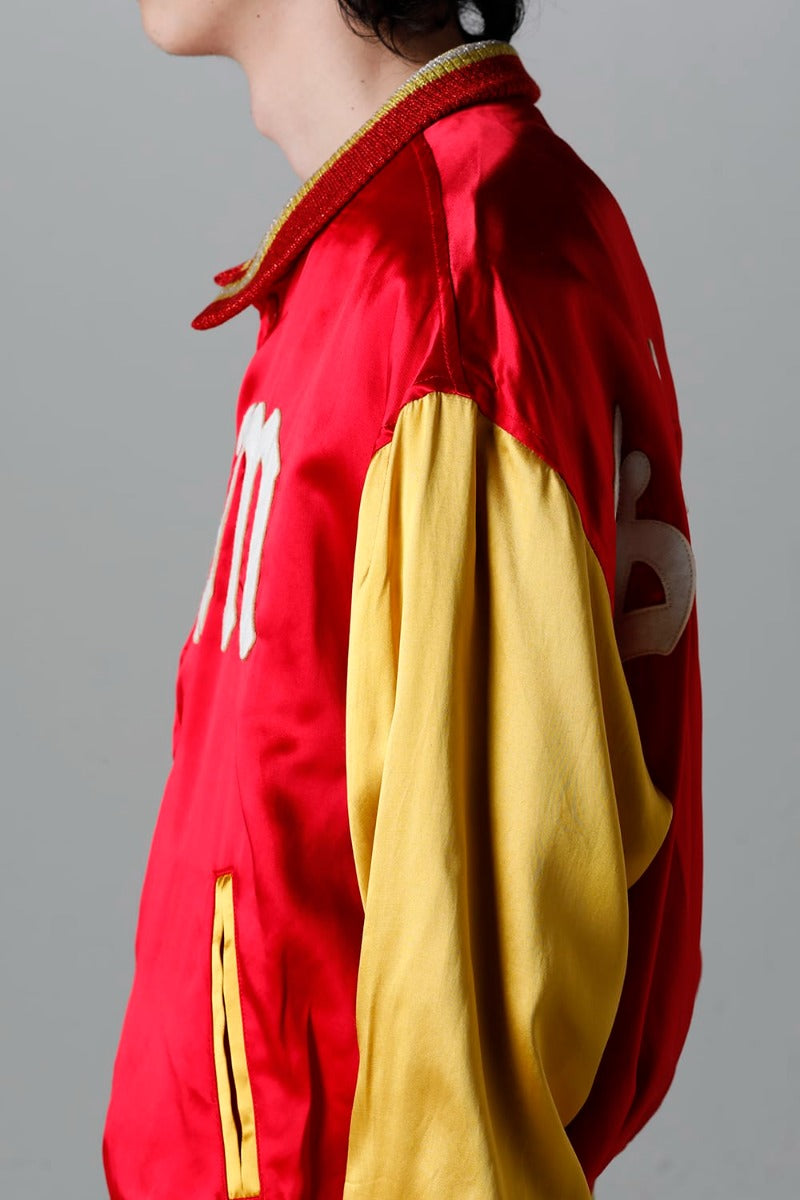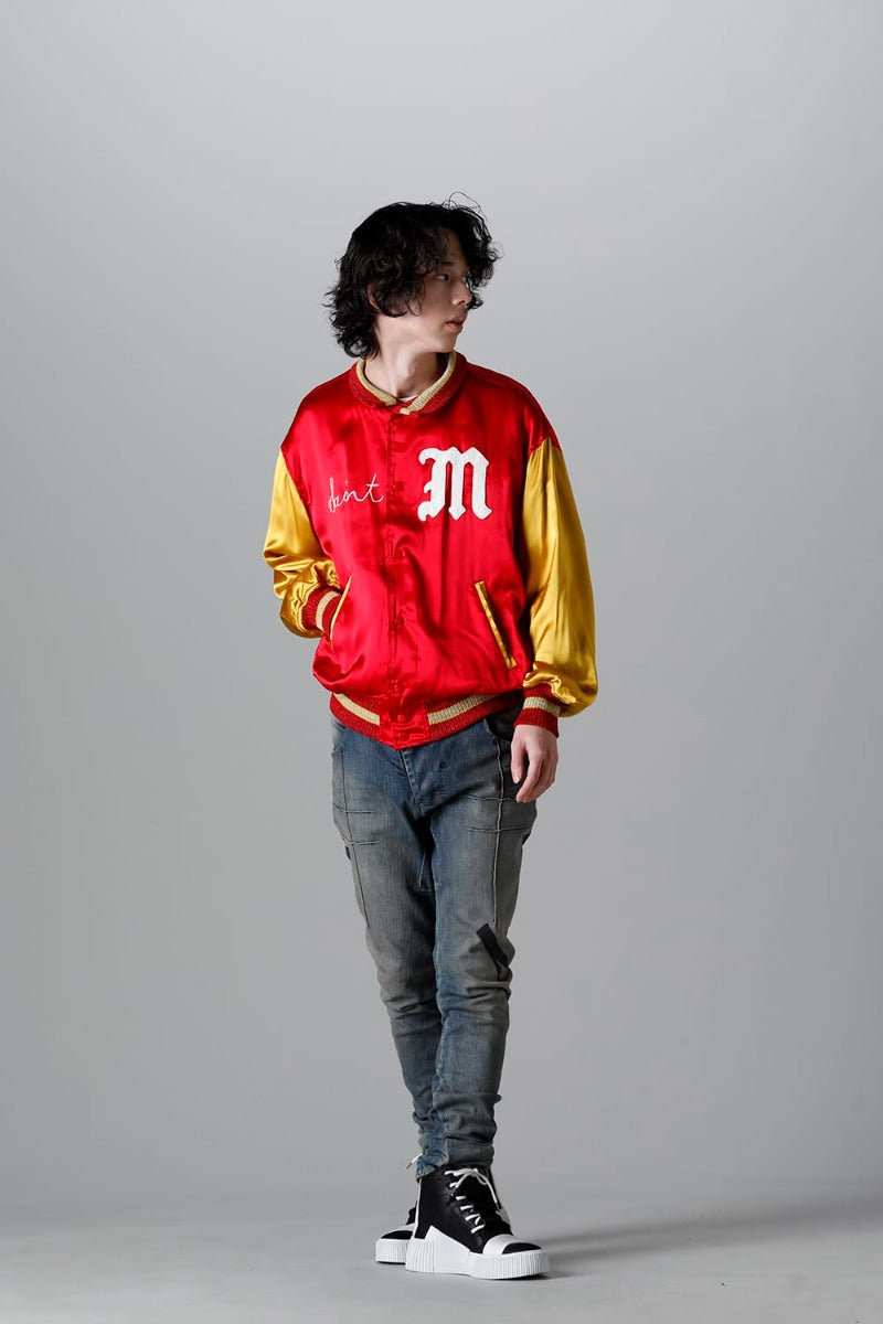 垂坠感和光泽感极具魅力的人造纤维面料的衣身,领子和罗纹部分采用了具有亮线质感的面料制成的大学夹克。