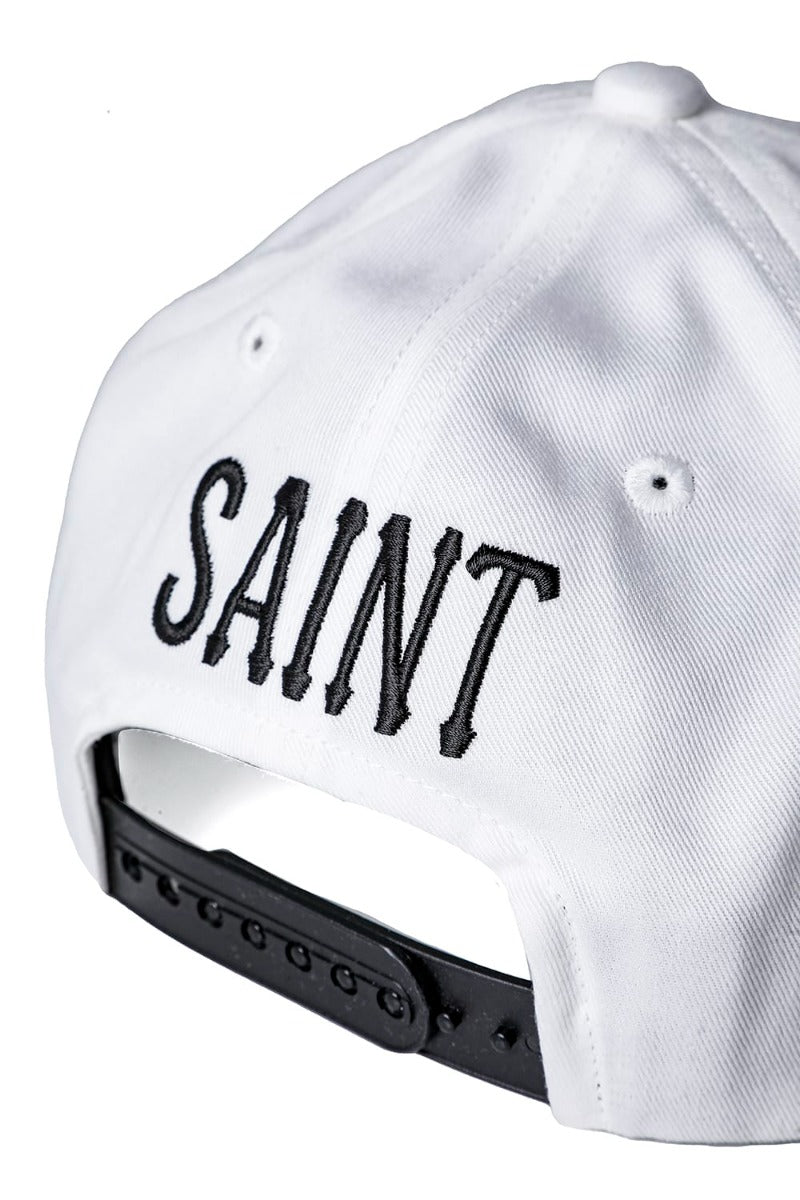 这款棒球帽在意味着死因的“POST MORTEM”上,加入了品牌名称“SAINT”拼贴而成的刺绣。
