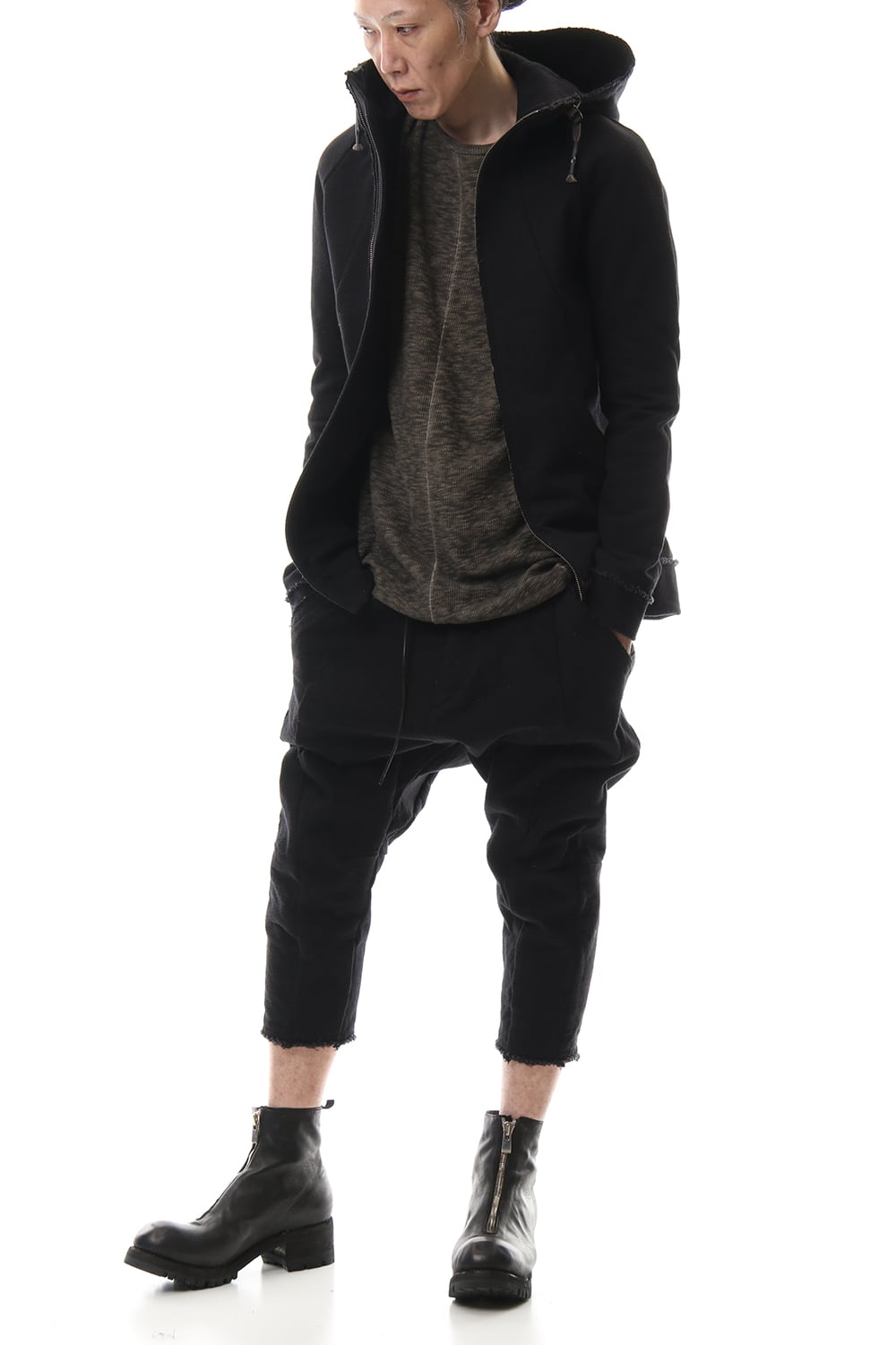 ・This item is made of cotton jersey fabric which is knitted to the limit using a special knitting machine. The black thread on the front and the charcoal thread on the back are woven by yarn-dyeing, so that the bias fabric generated from the color difference is made to appear lightly on the surface.