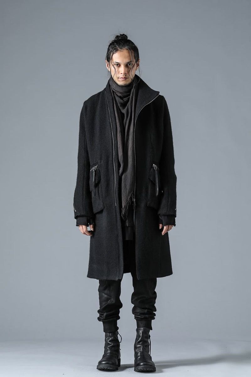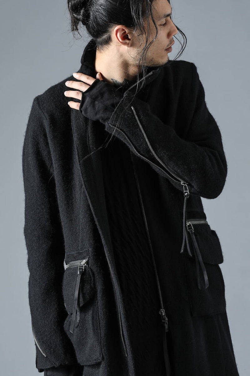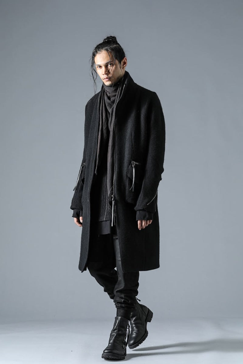 ・It uses tweed fabric woven in Bishu, Aichi Prefecture, using virgin wool from England. This fabric is characterized by its outstanding warmth and lightness. It is constructed with a three-dimensional, intricate pattern and has a relatively relaxed fit, but with a structured silhouette.