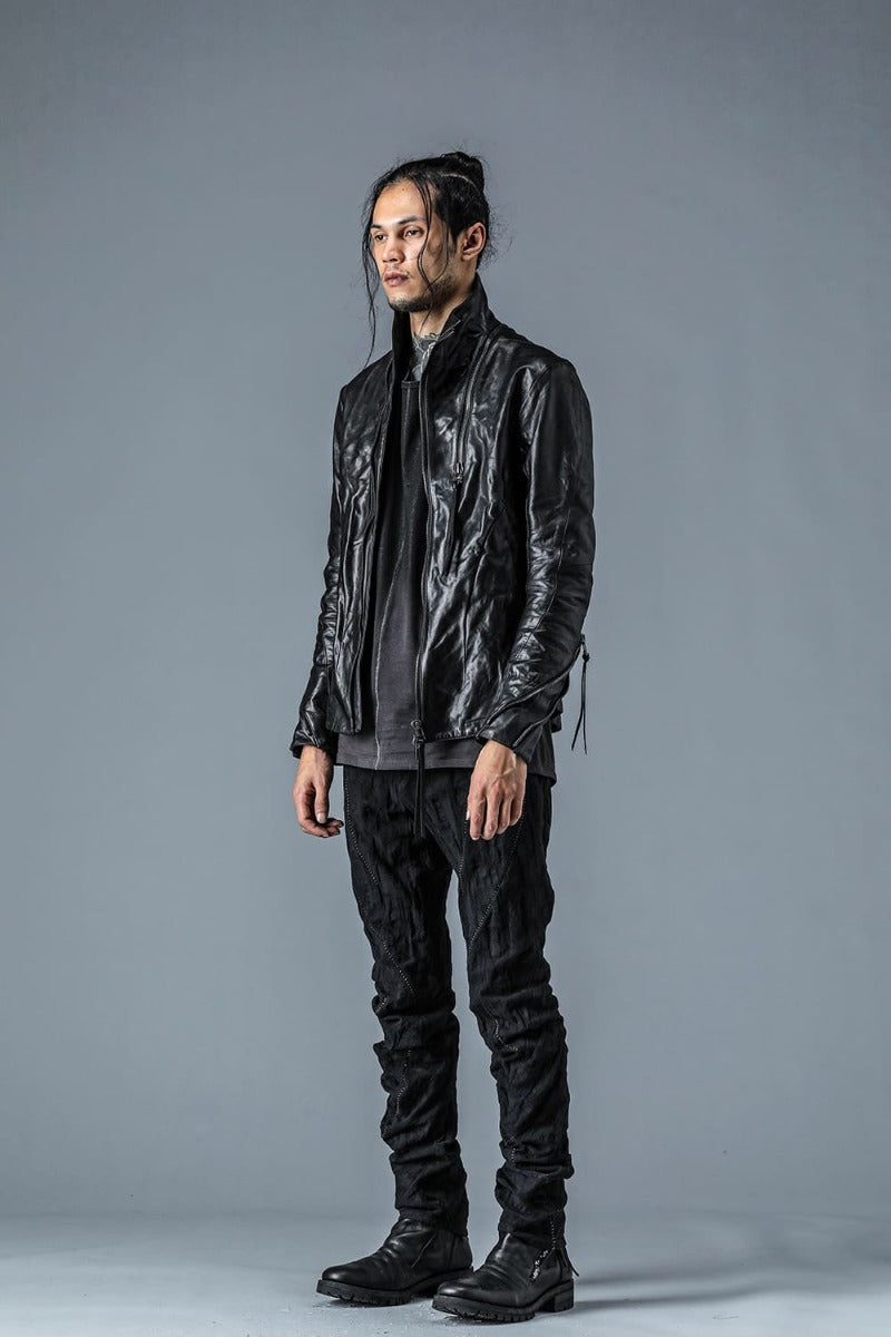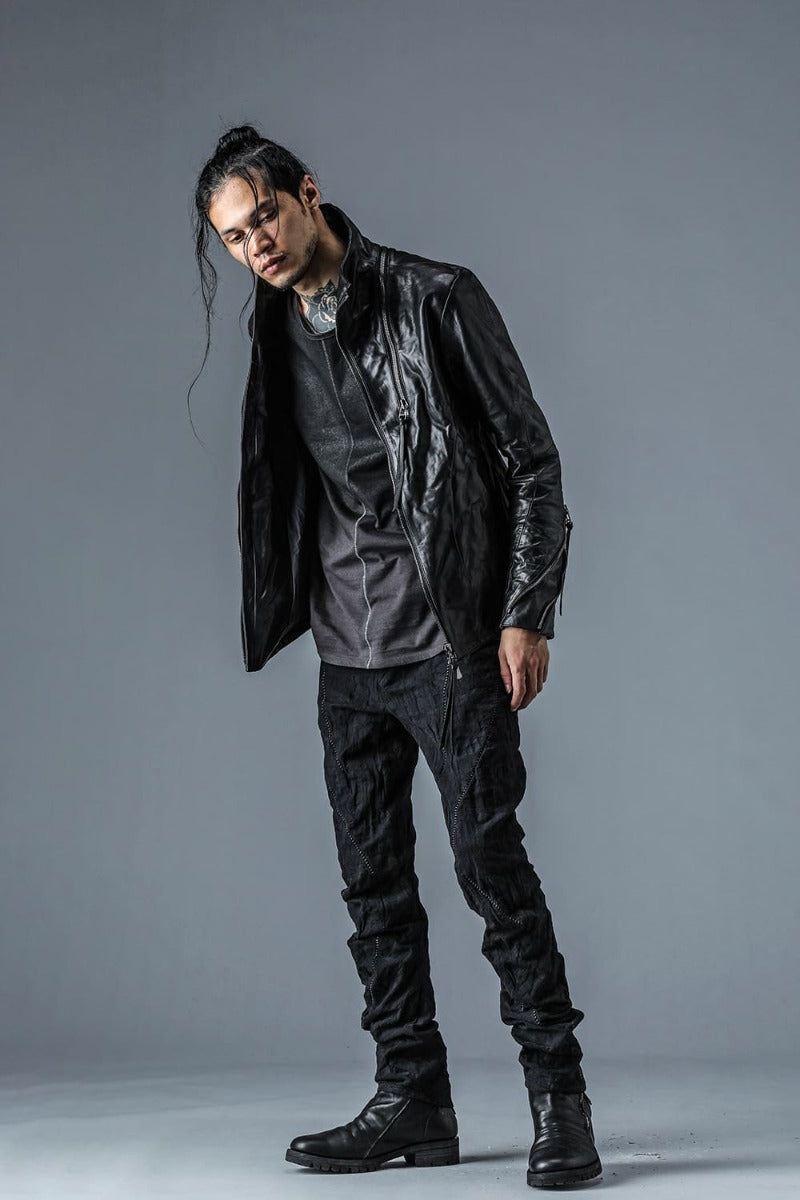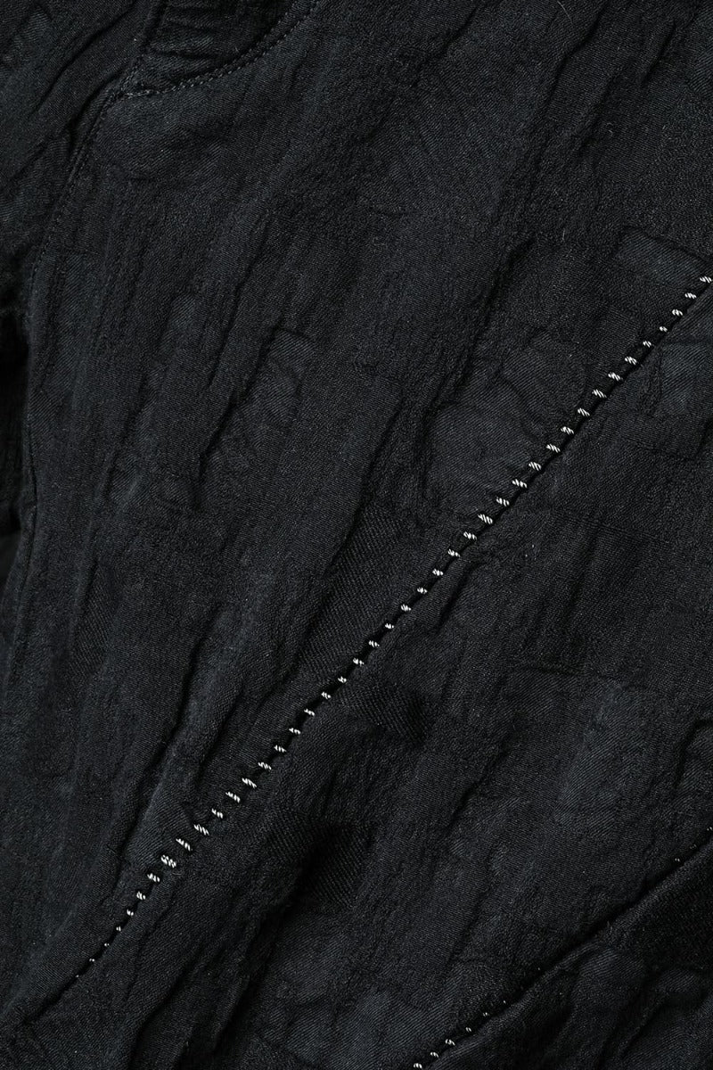 ・Original jacquard weave fabric with the impression of SCABS . Stretchability and three-dimensionality are enhanced by adding polyurethane to the weft yarns. The seam and darts create a three-dimensional effect, and the pattern is twisted backwards and sideways from the knees down, creating a more three-dimensional wrinkle when worn.