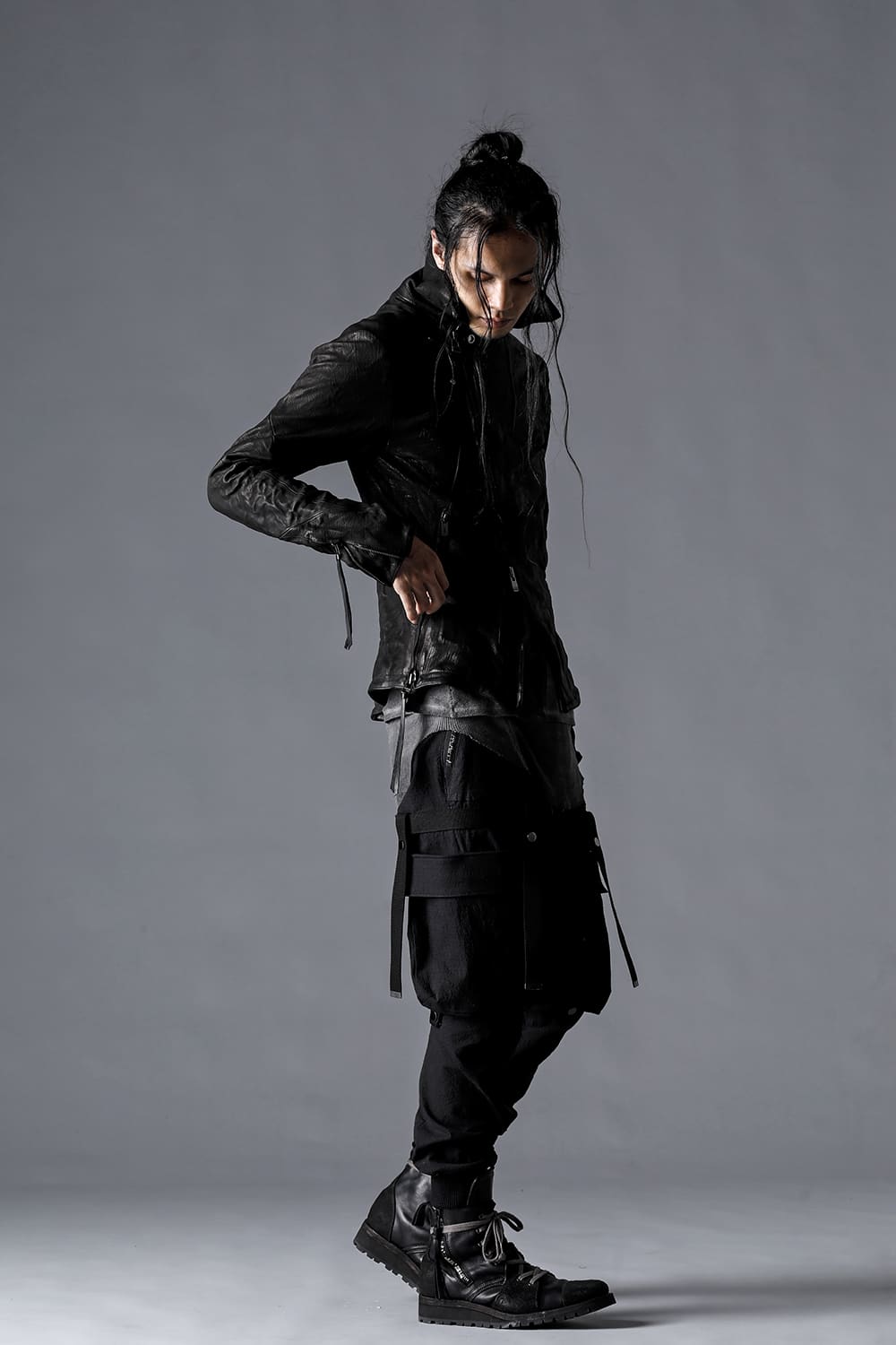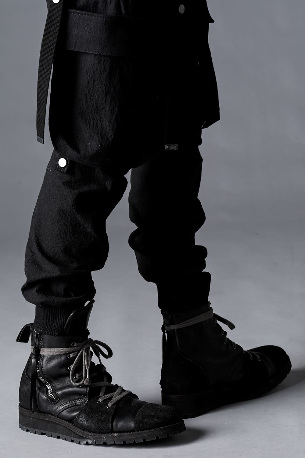 Slim, drop-crotch silhouette with deep inseam and detachable gusseted volume cargo pockets.