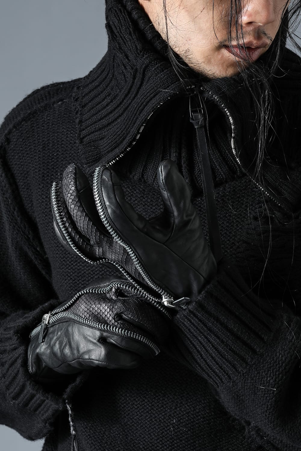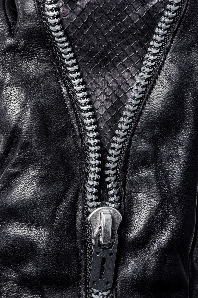 ・The zipper runs toward the tip of the index and ring fingers to create an impact design that looks like layered python leather.