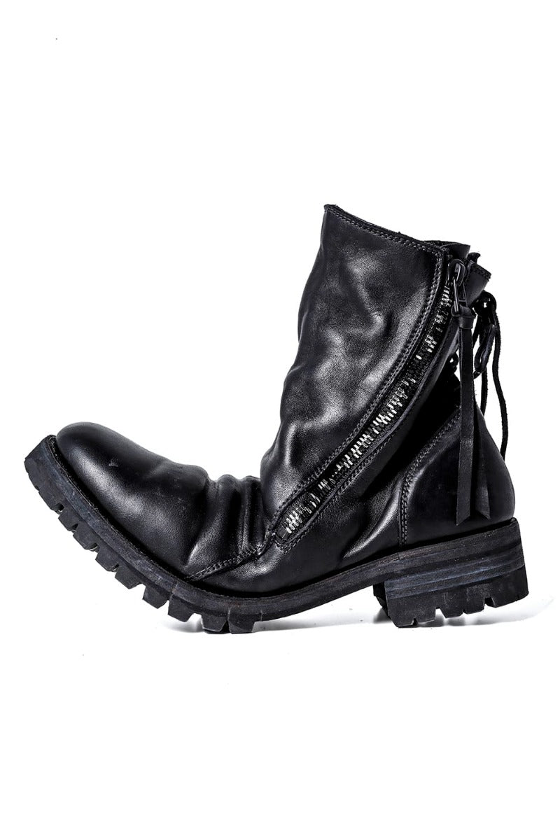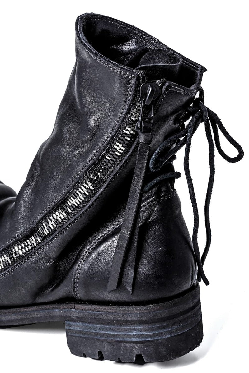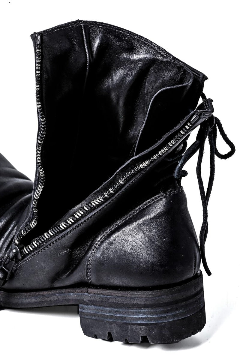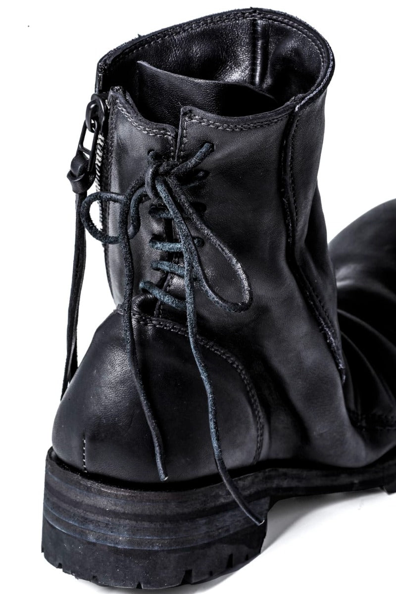 ・These lace-up boots are made of 1.5 mm thick full vegetable tanned horse leather, with flat, smooth-lined round toes, voluminous widths to ankle-length tapered shafts and sharp silhouettes.