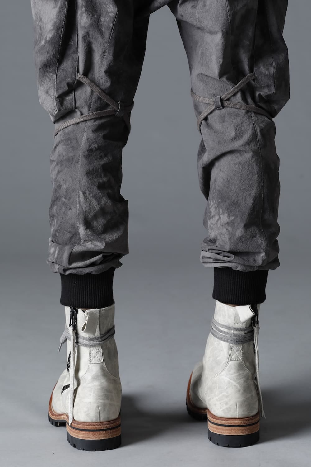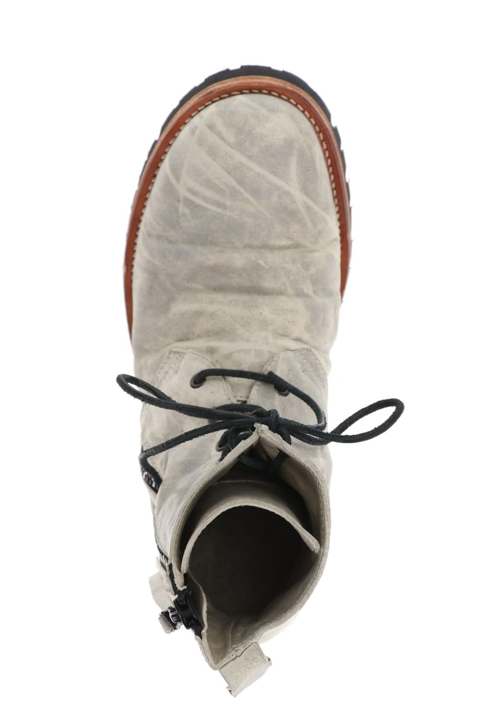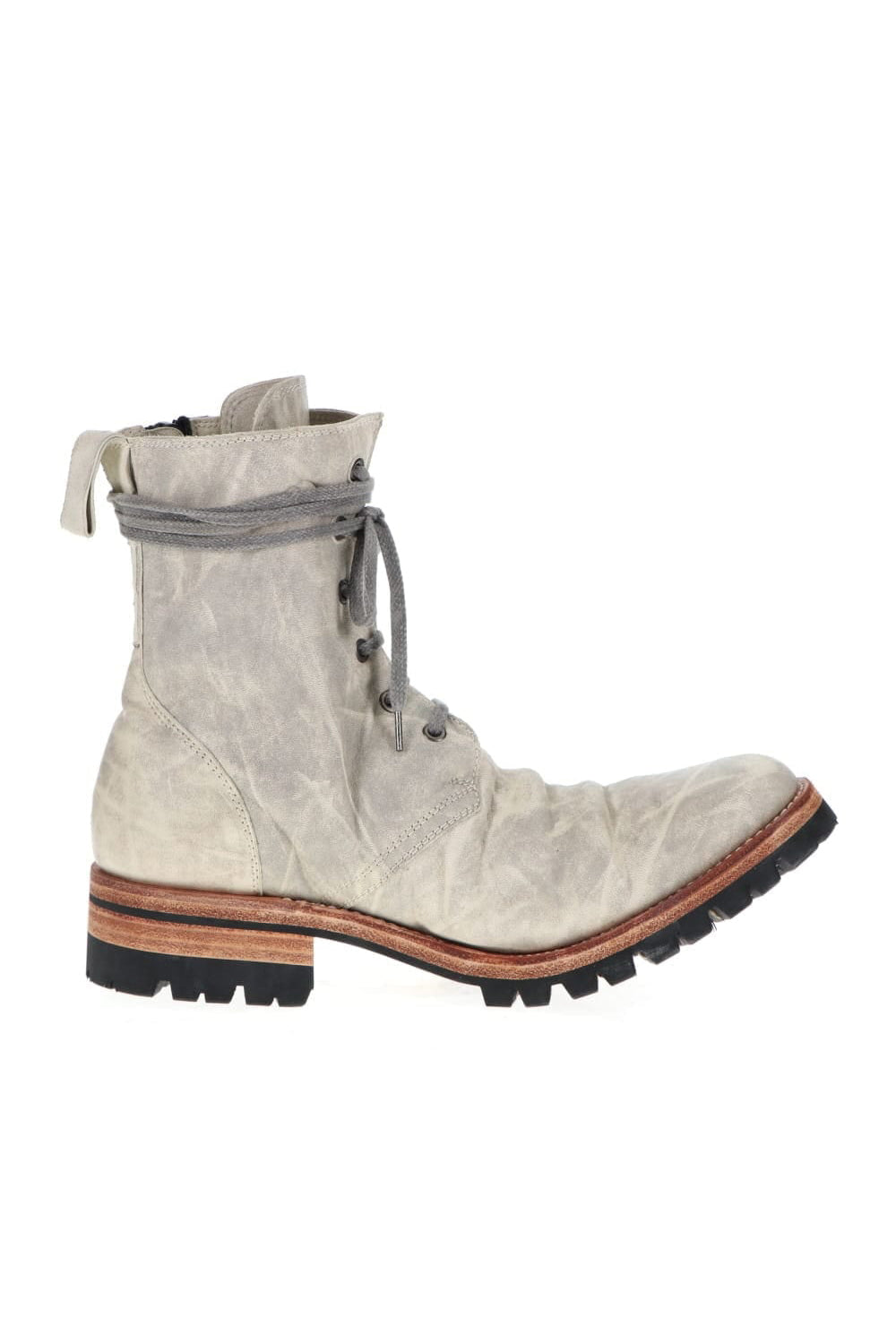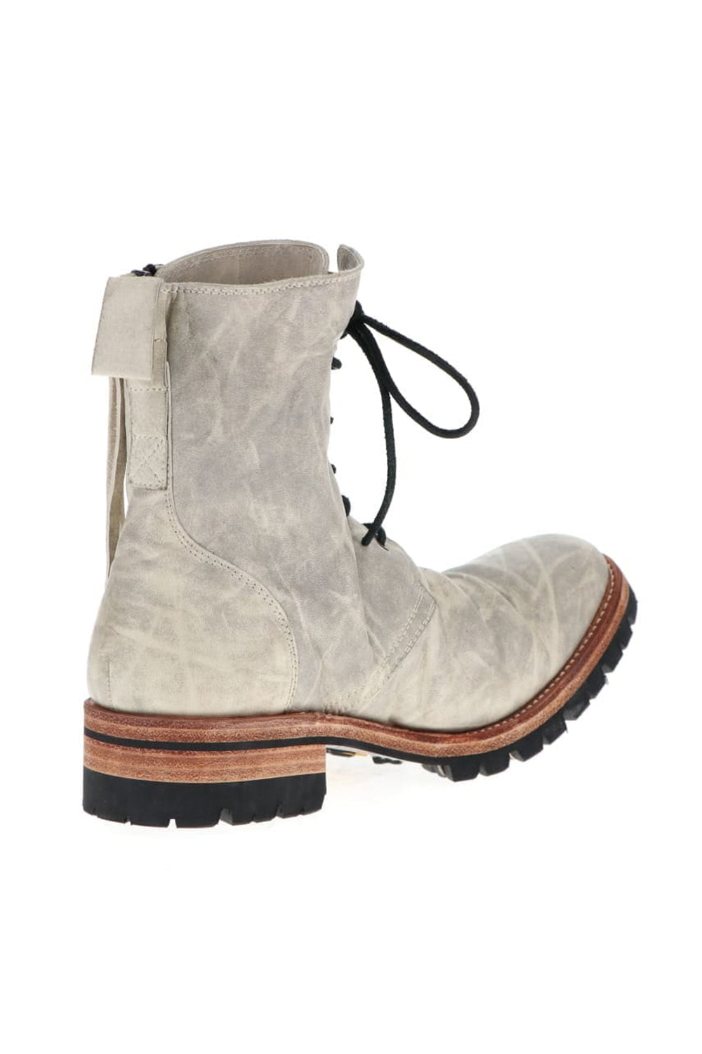 The lace-up boots are made of 1.5mm full vegetable-tanned horse leather, with a flat and smooth round toe, a voluminous waist and a slender ankle-length shaft.