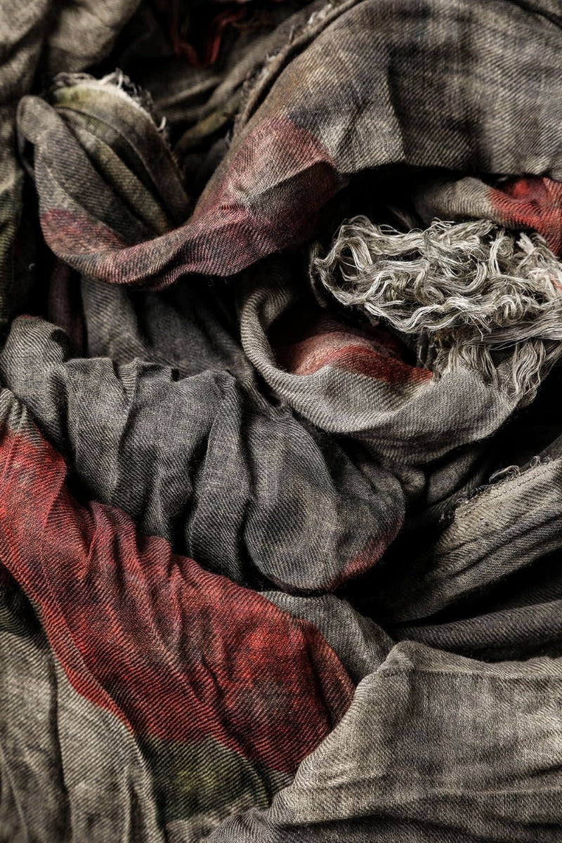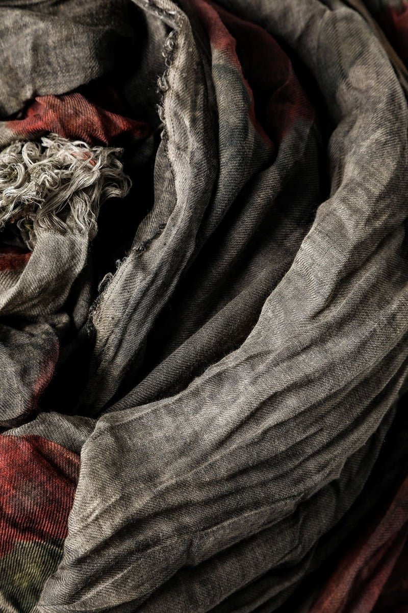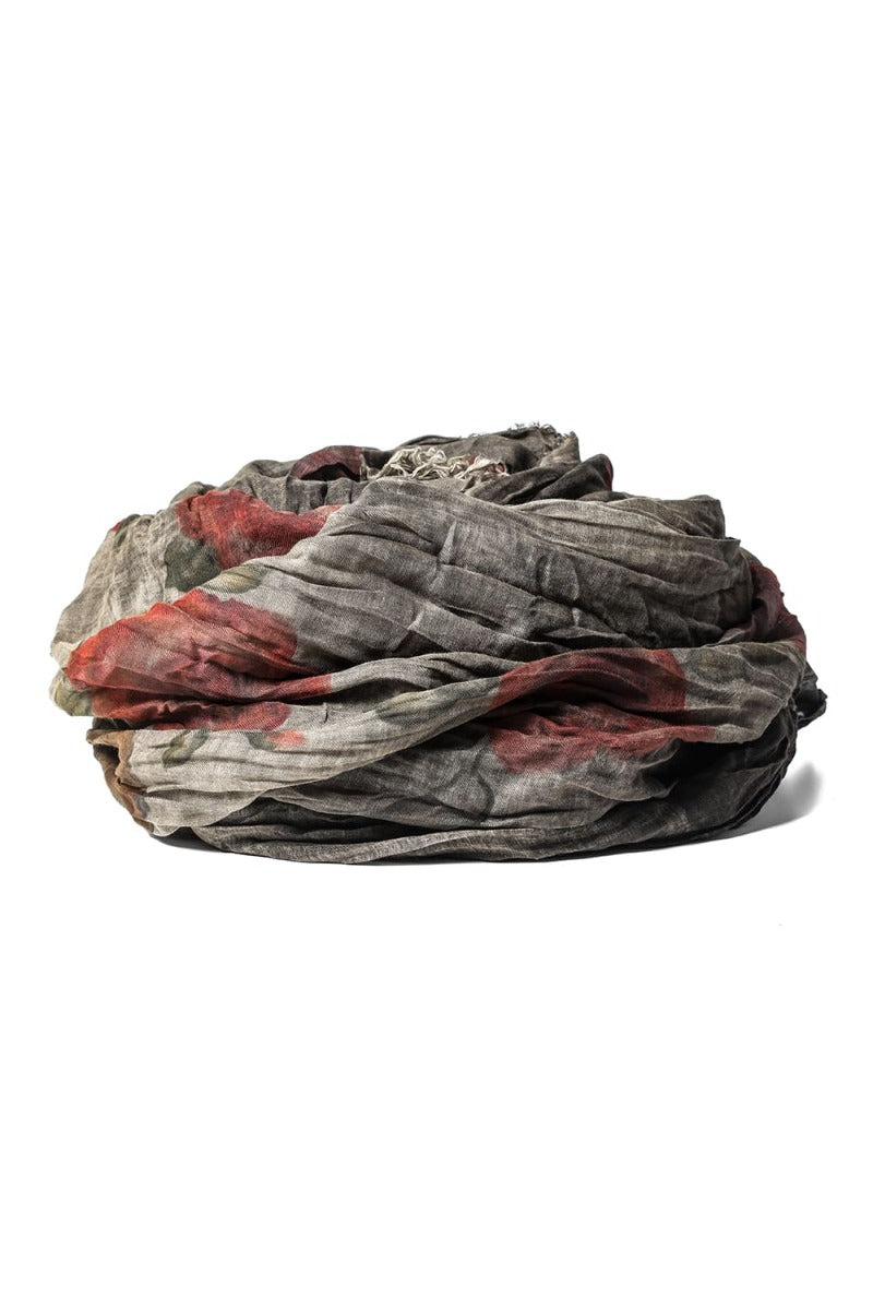 This large scarf is made of cotton fabric with a floral print used in UMA WANG's women's collection, dyed and wrinkled using a low-temperature dyeing process unique to Italian fabrics. The vivid red often seen in traditional Chinese colors is given an earthy image by the uneven dyeing. The texture is soft and fluffy, and the material is extremely soft and cool to the touch. This item can be useful as an accent in spring and summer.