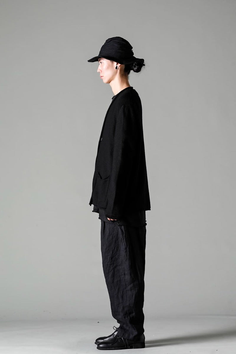 这是一款采用立体剪裁制作而成的短夹克。 使用了羊毛棉质面料,具有起伏感。具有手工制作特有的高级感。可以立领和普通翻领享受两种不同风格。这是一款精致小巧的短款夹克,与具有立体感的下装搭配也很容易取得平衡。腰部口袋也采用了与接缝线条相匹配的侧口袋型设计,采用了清爽小巧的前面板设计。胸部、侧面、内袋的所有口袋都采用了没有镶边的斜口袋设计,非常犀利。与UP026 354G:Baggy 5 Pocket Pants 可以进行搭配。