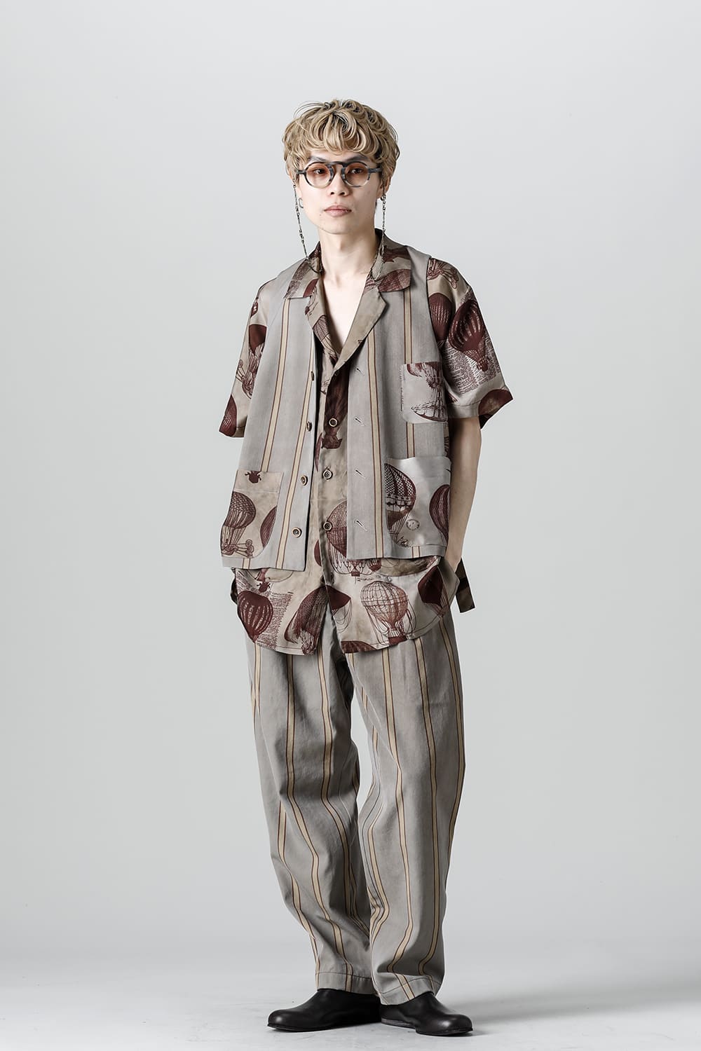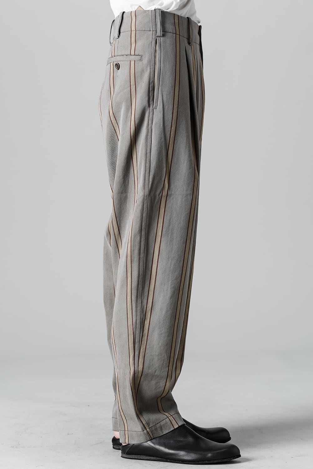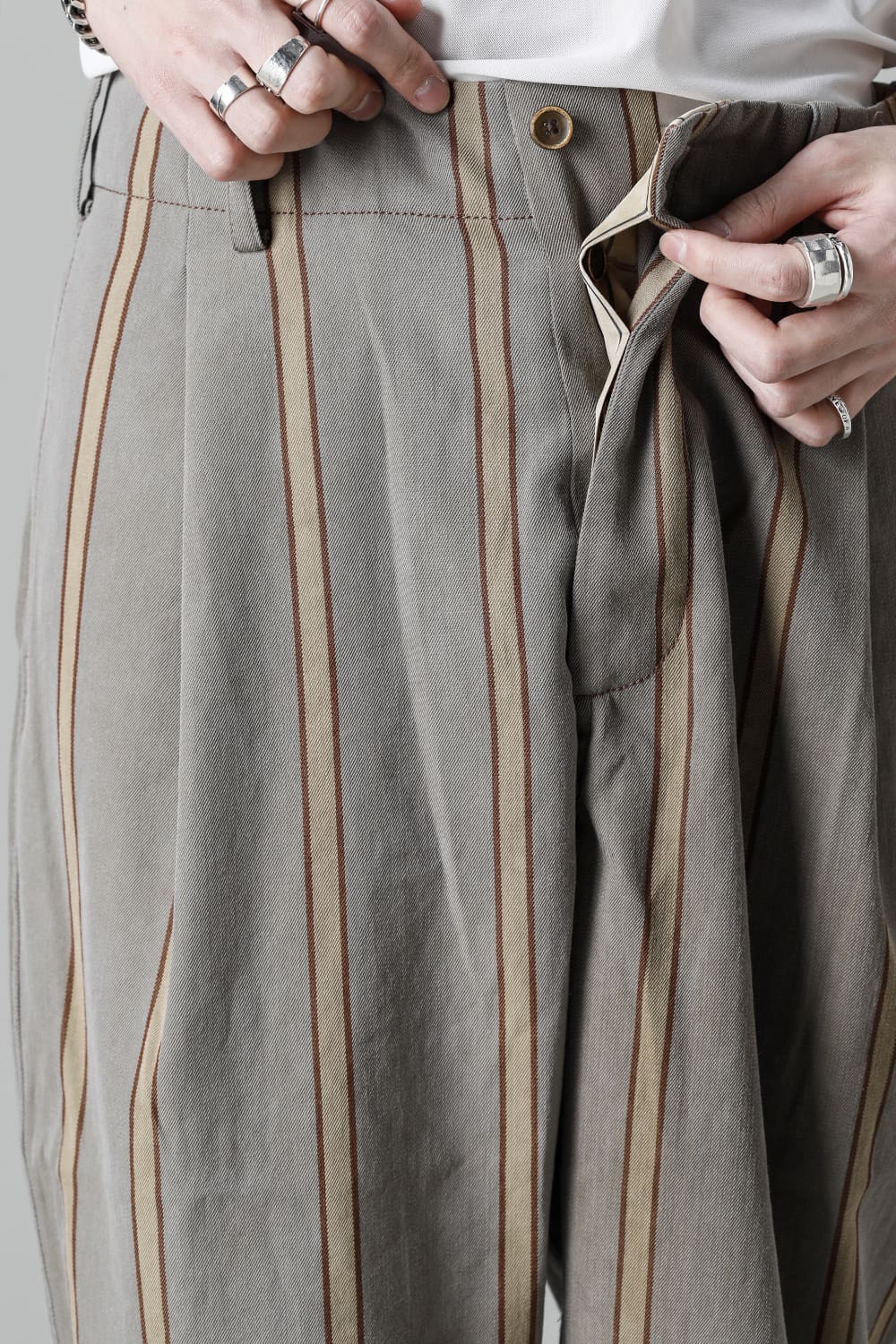 这是一款采用条纹棉质羊毛华达呢面料制成的褶裥锥形裤。维珍羊毛是出生后第一次收割的羊毛,其特点是毛尖纤细光滑,羊毛特有的光滑质感和棉质的干爽触感相结合,是一款穿着范围很广的裤子。细节部分的针脚使用了与条纹部分的配色相同的波尔多色线,连细节部分的配色都非常考究,极具女性设计师风格的一面也极具魅力。