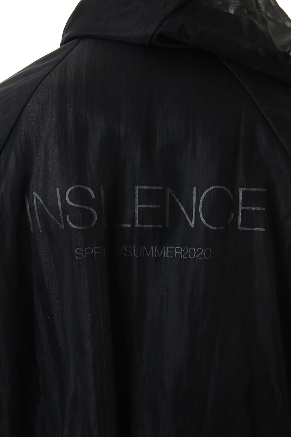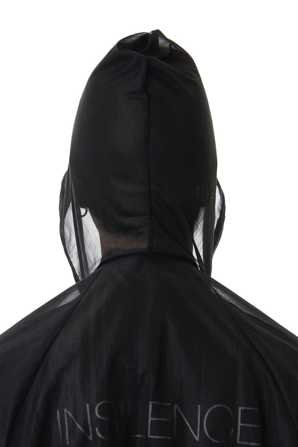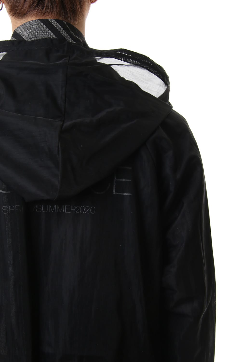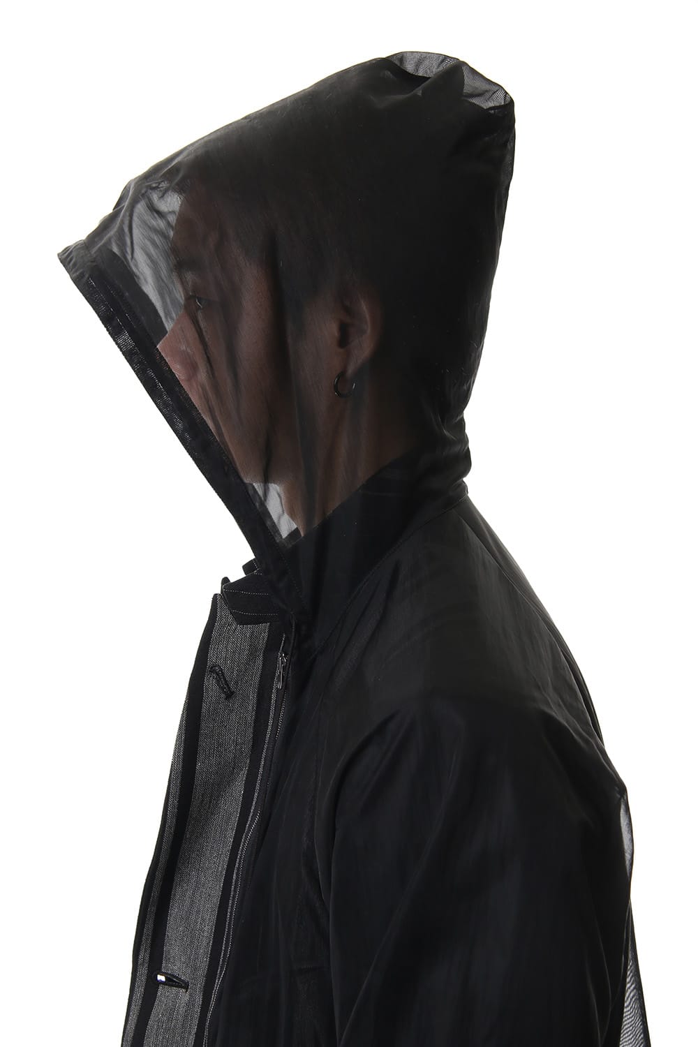 The hoodie is made of water-repellent see-through material and it is detachable.