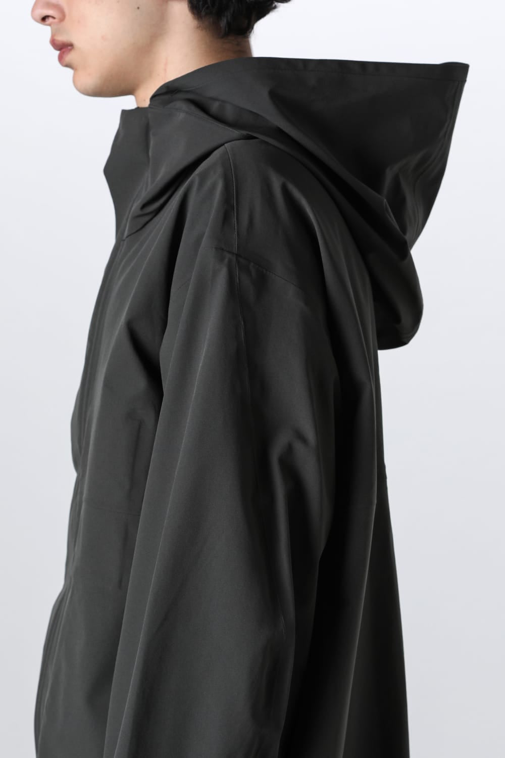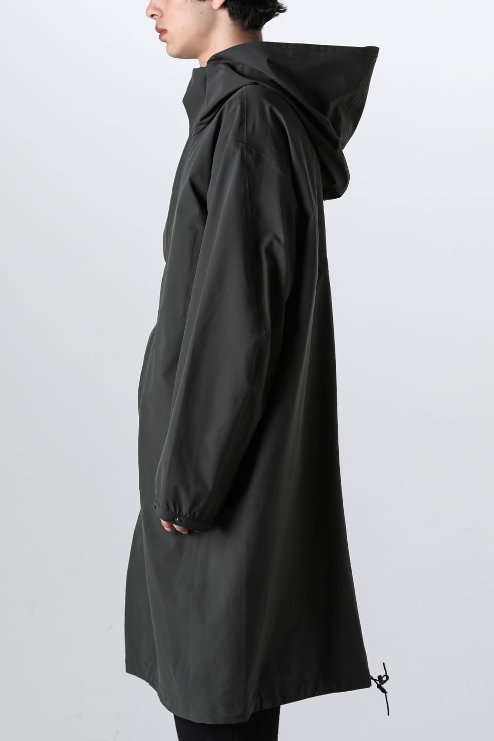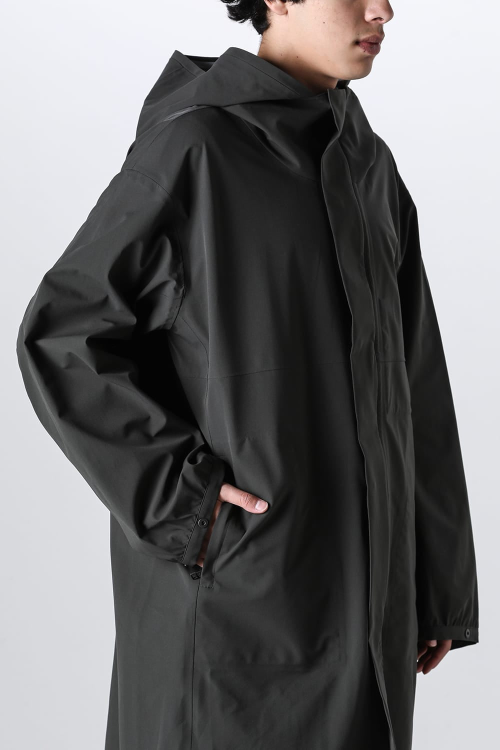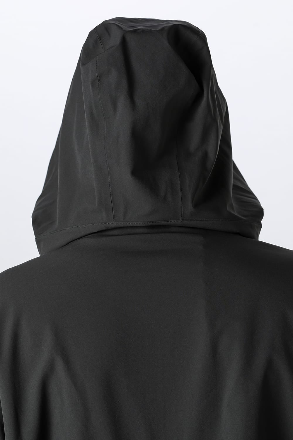 3-layer hooded coat made of stretchy water-repellent material.